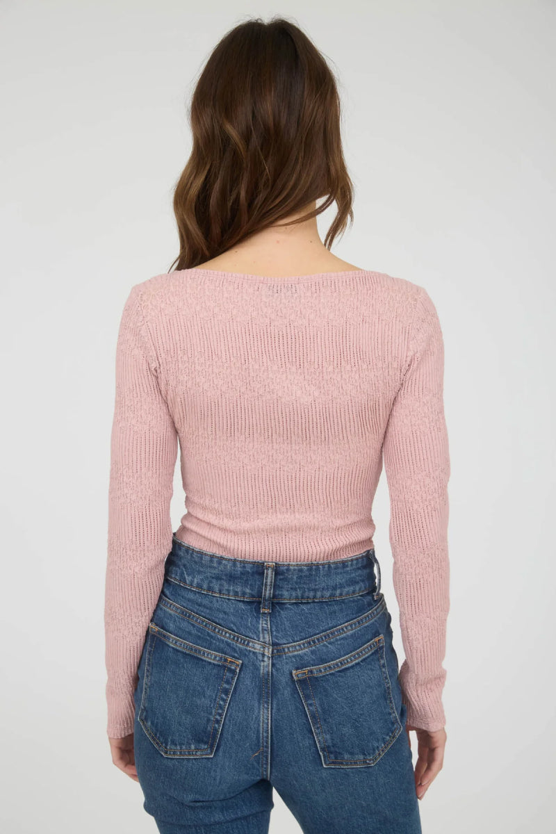 blu pepper's fitted Boatneck crochet sweater in a soft rib knit with a slim fit and long sleeves.